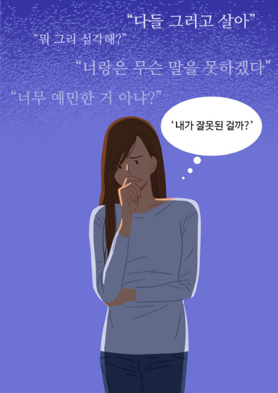 가해자들이 상대방에게 하는 말 중 가장 자주 하는 말이 예민하다는 것입니다. 남들은 크게 개의치 않는 행동도 피해자만 민감하게 받아들인다며 상대방 탓으로 밀어붙입니다. 유별난 사람 취급을 하면서 자존감을 떨어 뜨리는 것입니다.