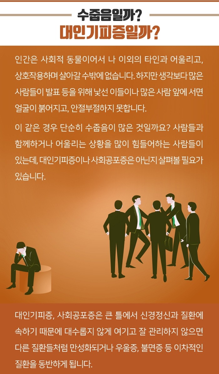하지만 그 정도가 지나쳐 일상생활에 불편함을 초래하거나 상황 자체가 오는 것을 두려워한다면, 이것은 정신과적 질환인 '대인기피증'의 가능성을 염두해 볼 수 있습니다.