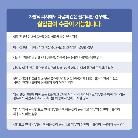 - 3. 부모나 동거 친족의 질병ㆍ부상 등으로 30일 이상 본인이 간호해야 하는 기간에 기업의 사정상 휴가나 휴직이 허용되지 않아 이직한다면 실업급여 지급 조건의 정확한 예외 사항은 하단의 고용보험 사이트에서 확인하시기 바래요.