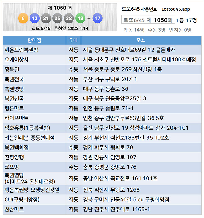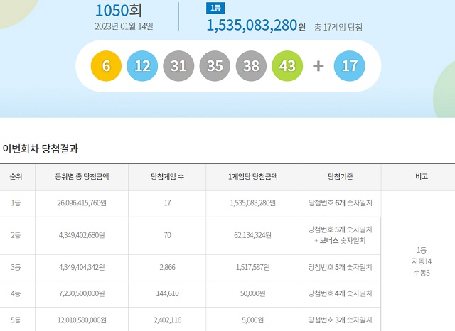 로또 당첨 번호 1131회 로또 1등 당첨게임 수는 총 17게임입니다.