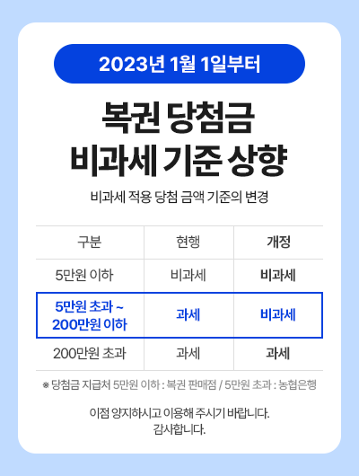 - 3등 이상의 당첨금은 NH농협은행에서 인적사항 확인 후, 제세금 원천징수 공제 후 지급