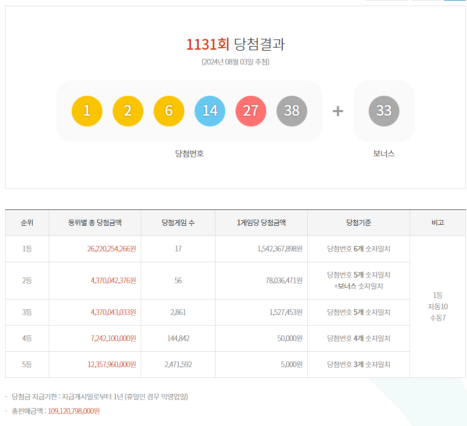 1131회 로또 당첨 번호 : 1, 2, 6, 14, 27, 38 보너스 번호 33